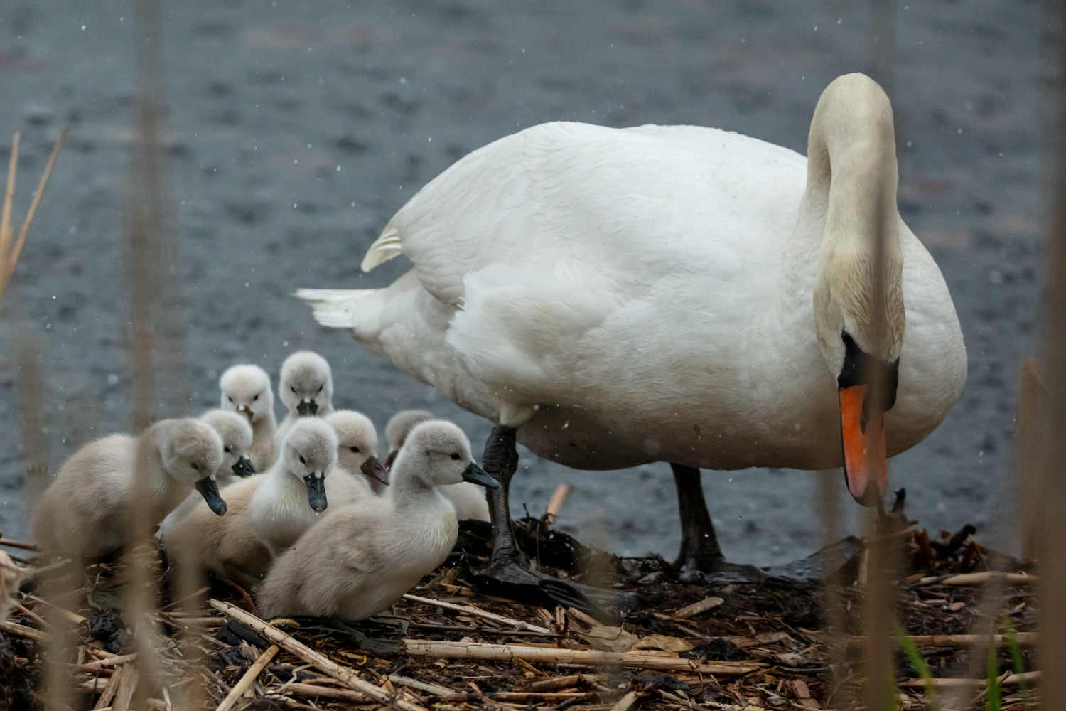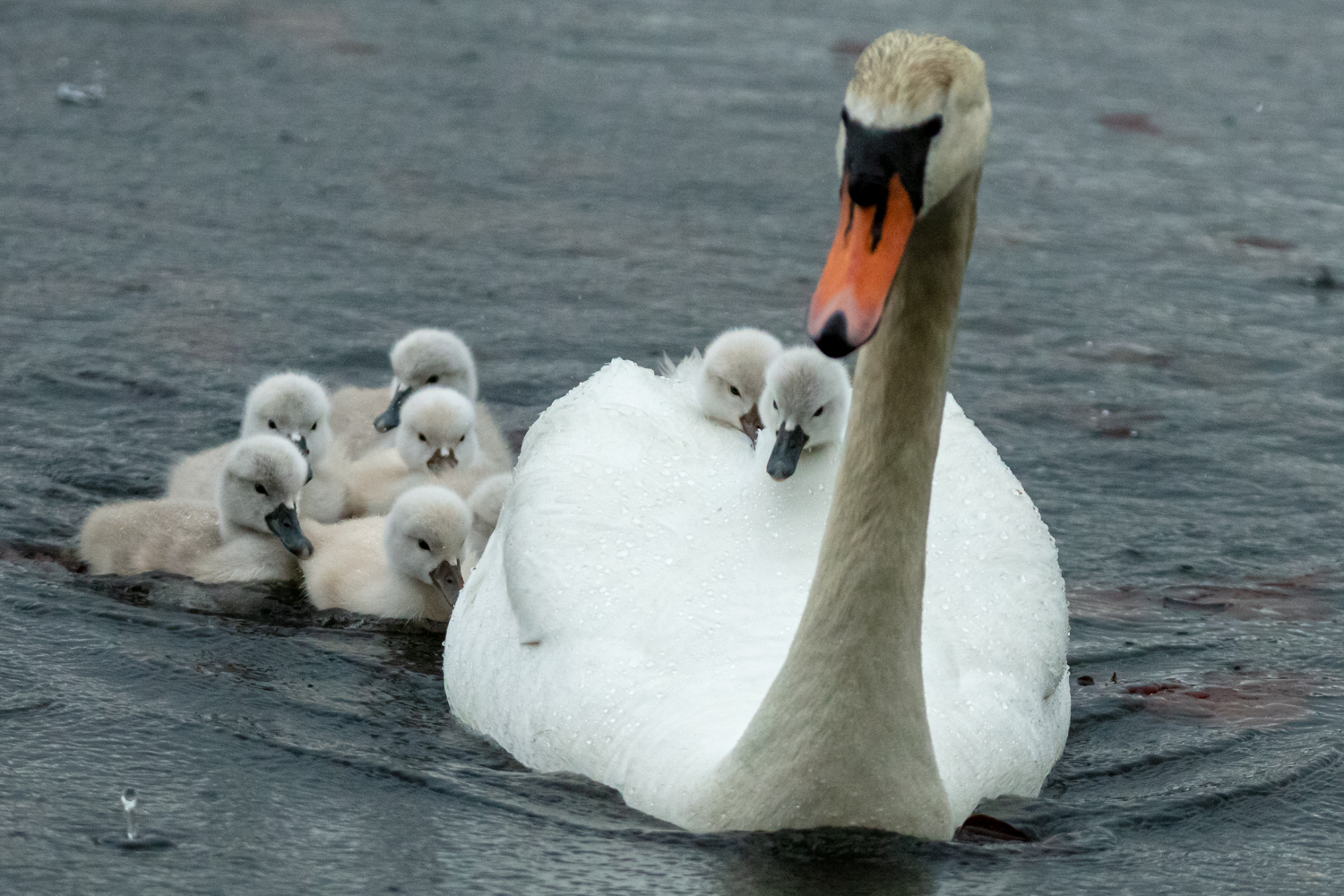 여덟 마리의 새끼들이 엄마를 따라 둥지로 헤엄쳐 오고 있었습니다.