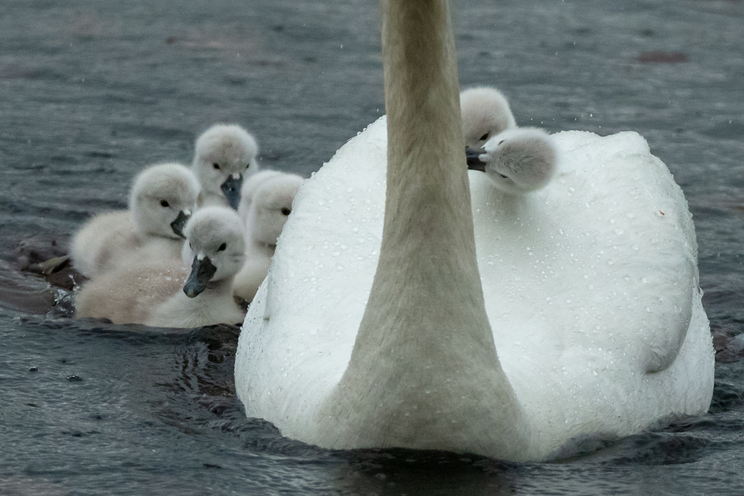 어미의 깃털 위에 빗방울 좀 보세요.