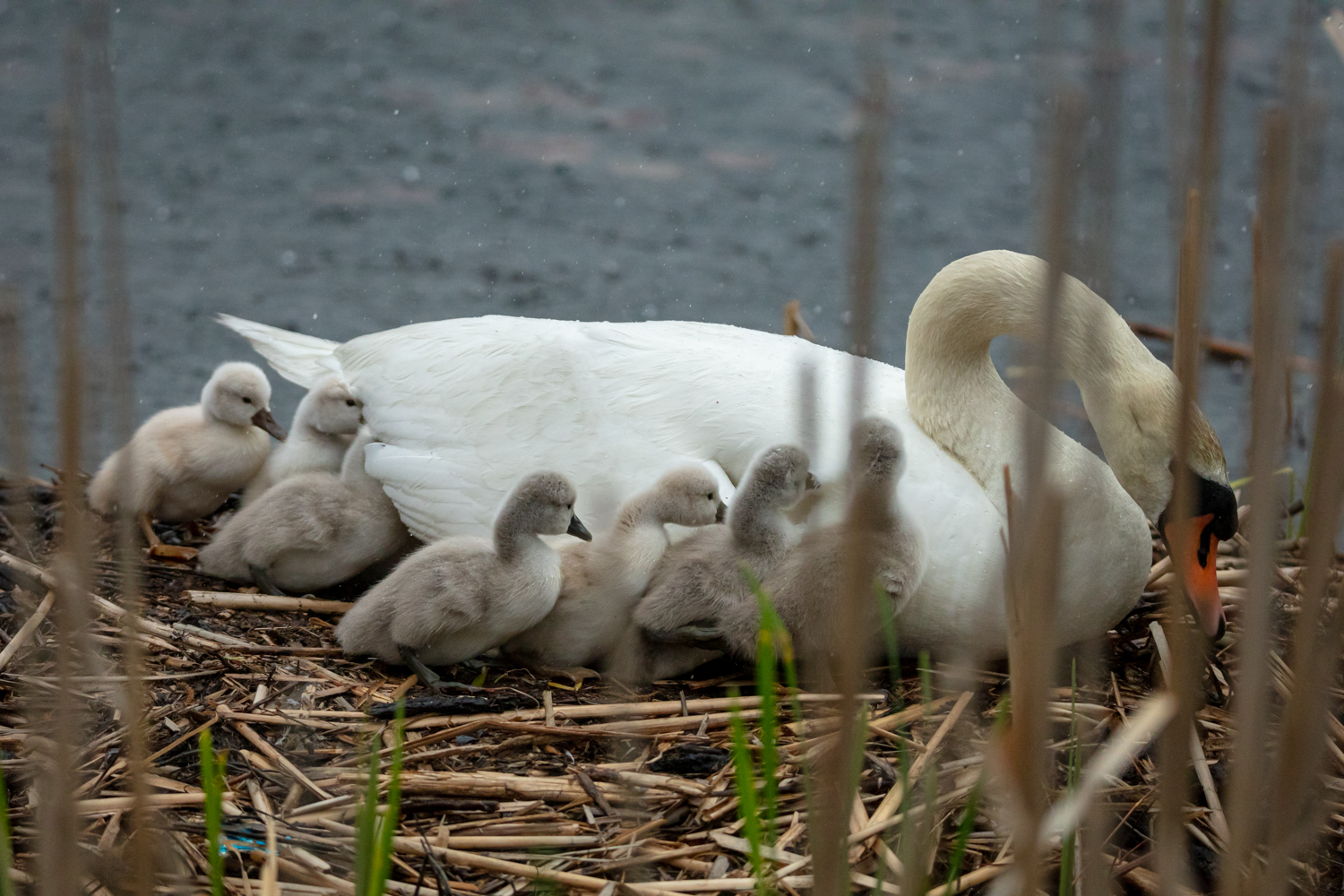 둥지에서 멀리 갔던 혹고니 가족이 어린 새끼들을 데리고